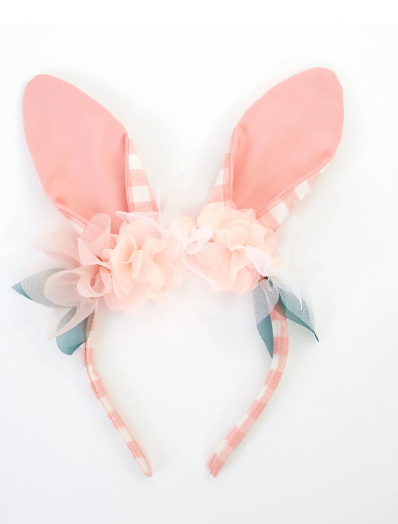The headband is adorned with peach and white organza flowers, with peach pompoms.